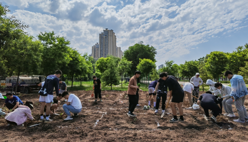 认领地块位于长安校区篮球场东侧空地。全体同学集合后,大家分工协作,有的整地挖坑、挑拣石块;有的施撒化肥、扶正幼苗;有的挥锹培土、提水浇灌,个个都干劲十足,每道工序都有条不紊进行。