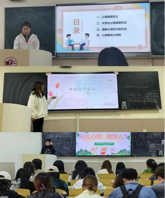 各班心理委员向同学们讲述心理健康的重要性,介绍了大学生日常面对的几种负面情绪,并依据心理学知识总结了几种排解坏情绪的方法,帮助同学们正确认识心理状态、做好情绪管理、处理好情绪问题,有助于促进同学们心理健康发展,学会在生活中保持乐观、向上的心态。