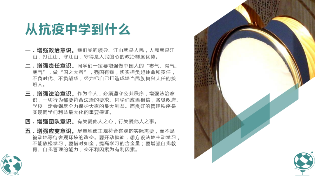 2019级研究生以“疫情防控、平安有你”为主题,从疫情严峻形势、相关政策规定、防控注意事项、心理健康疏导等方面进行介绍,号召同学们在防疫工作中有所思考、有所收获,增强政治意识、责任意识、法治意识、团队意识、应变意识,打好疫情防控战。