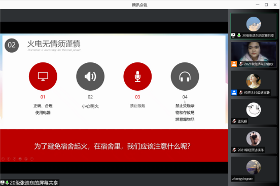 最后分享的是2020级研究生会生活部部长张浩东同学,张浩东主讲在宿舍应当如何预防火灾。火灾无情,需谨慎,他从四个方面展开论述:要正确合理的使用电器;小心明火;禁止吸烟;禁止焚烧杂物和存放易燃易爆的危险物品。