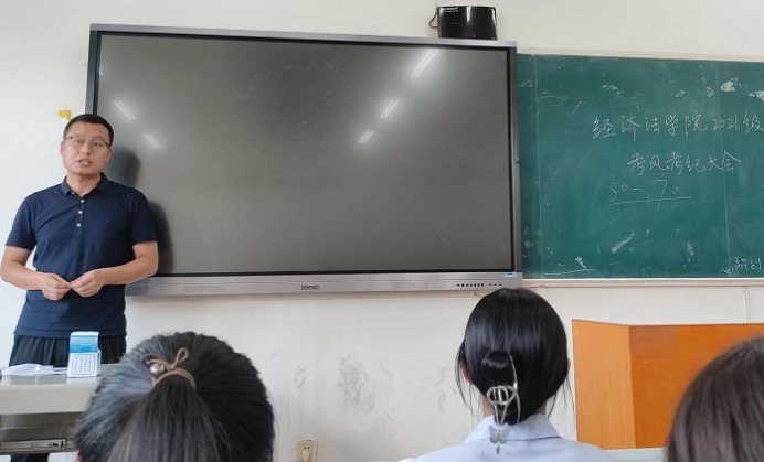 组织2021级学生在长安校区天平楼A302召开本学期考风考纪宣讲大会,会议由2021级7班班长金效田同学主持,辅导员李冬冬参加会议。