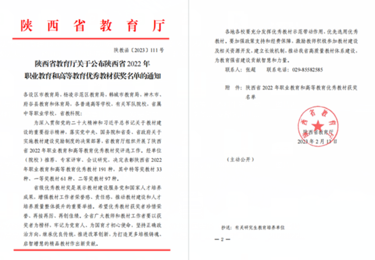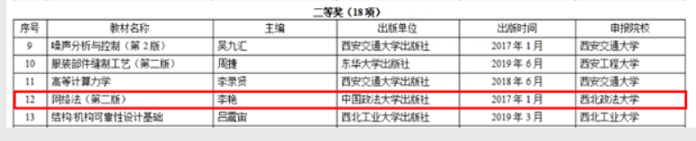 近日,陕西省教育厅印发《关于公布陕西省2022年职业教育和高等教育优秀教材获奖名单的通知》(陕教函〔2023〕111号),永利娱乐场官网 知识产权法教研室李艳副教授李艳副教授主编的《网络法(第二版)》荣获研究生教育类二等奖。