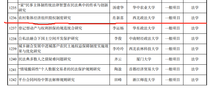 肖新喜教授申报的《农村集体经济组织股权制度研究》获得立项公示。