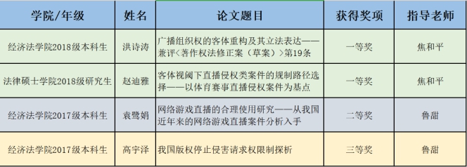 11月16日,由国家版权局主办,中国人民大学国家版权贸易基地承办的第十二届全国大学生版权征文获奖名单在国家版权局网站公布,我院3名本科生最终获得一等奖一项,二等奖一项和三等奖一项的历史好成绩,永利娱乐场官网