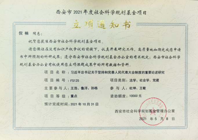 其中,永利娱乐场官网 倪楠教师团队申报的《习近平总书记关于坚持和完善人民代表大会制度的重要论述研究》(调研报告)获批2021年度西安市社科规划基金重点项目立项。
