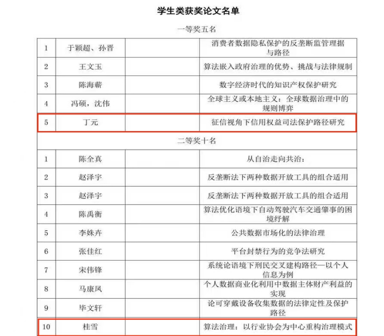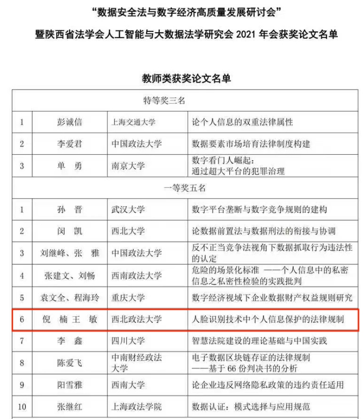 倪楠教授、王敏同学所投稿《人脸识别中个人信息保护的法律规制》获得教师组一等奖;研究生丁元同学所投稿《征信视角下信用权益司法保护路径研究》获得学生组一等奖;研究生桂雪同学所投稿《算法治理:以行业协会为中心重构治理模式》获得学生组二等奖。