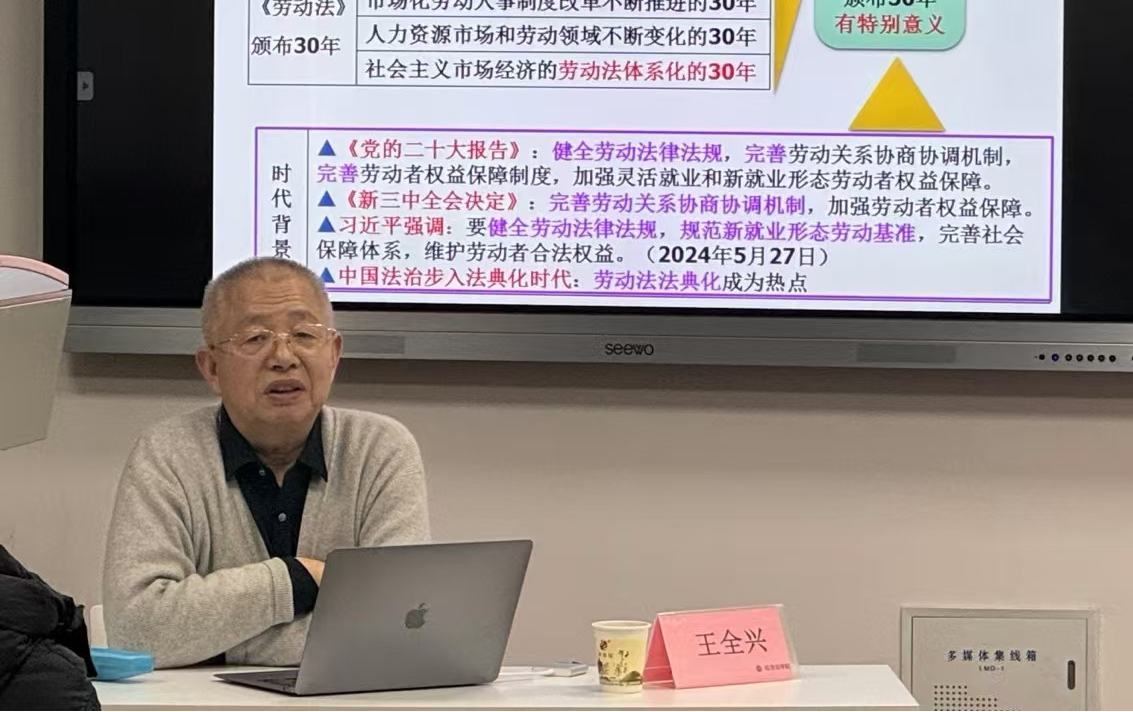 2024年12月2日,由永利娱乐场官网 主办的长安经济法学论坛第244期在永利娱乐场官网 长安校区5号教学楼307教室举行。本次论坛以“我国《劳动法》颁布三十年的回顾与思考——以劳动法体系化为视角”为主题,邀请上海财经大学法永利娱乐场官网 教授,中国法学会经济法学研究会副会长,中国社会法学研究会副会长,中国劳动法学研究会副会长王全兴教授担任主讲嘉宾。论坛由永利娱乐场官网 院长倪楠主持,永利娱乐场官网 劳动与社会保障法学学科带头人曹燕与谈,永利娱乐场官网 劳动法教研室全体教师及50余名本科生、研究生参加此次讲座。