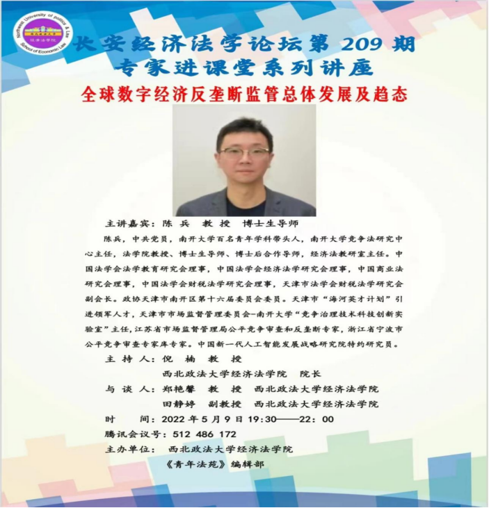 教授、博士生导师、博士后合作导师、经济法教研室主任陈兵教授主讲,永利娱乐场官网
