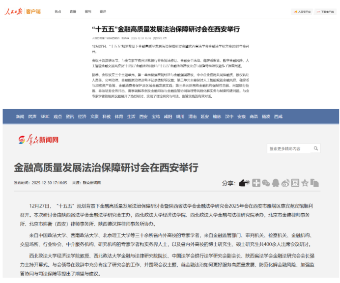 12月27日,“十五五”规划背景下金融高质量发展法治保障研讨会暨陕西省法学会金融法学研究会2025年会在西安市雁塔区惠宾苑宾馆顺利召开。本次研讨会由陕西省法学会金融法学研究会主办,永利娱乐场官网 、永利娱乐场官网 金融与法律研究院承办,北京市金德律师事务所、北京市炜衡(西安)律师事务所、陕西德汉辉律师事务所协办。 来自中国政法大学、西南政法大学、北京理工大学等三十余所省内外高校的专家学者,来自金融监管部门、审判机关、检察机关、金融机构、交易场所、行业协会、中介服务机构、研究机构的专家学者和实务界人士,以及省内外高校的博士研究生、硕士研究生共400余人出席会议研讨。 永利娱乐场官网 教授、永利娱乐场官网 金融与法律研究院院长、中国法学会银行法学研究会副会长、陕西省法学会金融法研究会会长强力主持开幕式。与会领导在致辞中充分肯定了研究会的工作,并围绕会议主题,就金融法治如何更好服务高质量发展、防范化解金融风险、加强监管协同与司法保障等提出了期望与建议。 会议进入主旨演讲环节,中国法学会银行法学研究会会长、中国政法大学教授、博士生导师王卫国教授,西南政法大学原副校长教授、中国法学会银行法学研究会副会长岳彩申教授,中国政法大学教授、博士生导师、中国法学会银行法学研究会副会长刘少军教授等七位知名学者,分别就银行业监管法修订、金融安全法治、稳定币监管、数字金融风险、人工智能金融交易风控及“十四五”金融法治回顾与“十五五”金融法治建设重点与展望等前沿重大议题作了深度阐述。 会议设立了三个主题单元。第一单元“强国建设的金融改革发展法治重点”,聚焦宏观经济与金融强国建设、中小企业信用共同体融资、股权转让人责任、公司治理、金融数据治理及电子记录债权等议题,郭晗、杨军、薛波等六位学者发表演讲。第二单元“金融‘五篇大文章’的法治保障”,探讨了人工智能赋能金融风控、稳定币与加密资产监管、金融消费者保护及区域金融发展实践,王德军、陈蓉、陈胜等七位嘉宾发言。第三单元“金融风险防范化解体系的法治构建”,围绕金融机构强制性自救、问题银行处置、非法证券业务打击、商事调解条例及金融司法与金融监管协同治理等风险化解实务与制度构建问题,敖希颖、凤建军、翟静波等七位嘉宾展开交流。与会专家学者就相关议题展开了热烈研讨,实现了理论研究与司法、监管实践的有效对话。 闭幕式上,刘少军教授发表致辞,对会议成果及年轻学者的涌现表示赞赏。强力会长作总结致辞,回顾了研究会与国家金融法治同行的历程,展望了“十五五”时期金融立法与修法的重点任务,并强调金融法治建设需在“有为政府”与“有效市场”间寻求平衡,注重法律适用的谦抑性,以法治力量保障经济活力与金融安全。会议在热烈务实的氛围中圆满落幕。 本次年会系统总结了“十四五”时期金融法治成就,深入研讨了“十五五”时期金融高质量发展面临的核心法治课题,形成了丰硕的思想成果,为以高水平法治保障金融强国建设凝聚了共识、贡献了智慧。 【人民日报】“十五五”金融高质量发展法治保障研讨会在西安举行 //www.peopleapp.com/column/30051109340-500007284508 【群众新闻】金融高质量发展法治保障研讨会在西安举行 //www.sxdaily.com.cn/2025-12/30/content_11469245.html#10006-weixin-1-52626-6b3bffd01fdde4900130bc5a2751b6d1