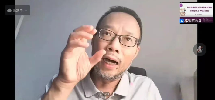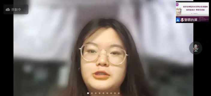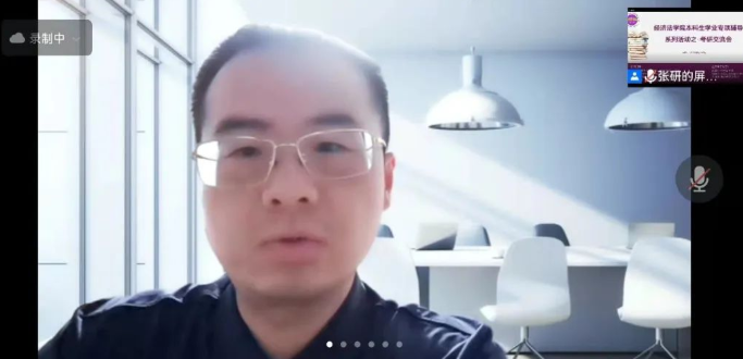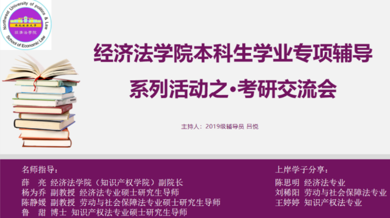 会议由2019级辅导员吕悦老师担任主持人,永利娱乐场官网 副院长薛亮副教授、经济法专业硕士研究生导师杨为乔副教授、劳动与社会保障法专业硕士研究生导师陈静媛副教授与知识产权法专业硕士研究生鲁甜博士在线辅导。会议同时邀请了三位考研上岸同学进行经验分享。2019级近百位本科生参加了本次会议。