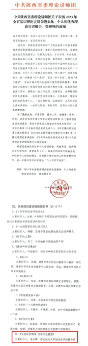 近日,中共陕西省委理论讲师团印发《关于表扬2023年全省基层理论宣讲先进集体、个人和优秀理论宣讲报告、微视频的通知》,永利娱乐场官网