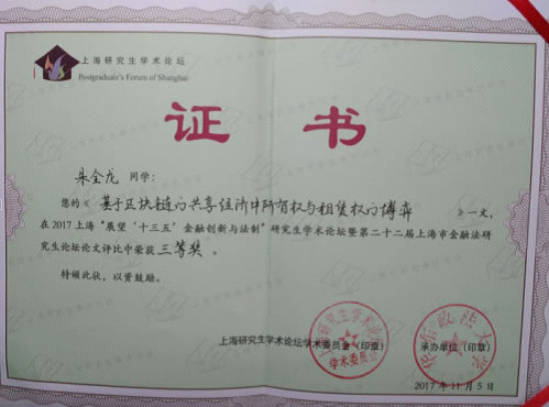 114-5日,由上海市学位委员会主办、华东政法大学承办的2017年上海展望十三五金融创新与法制研究生学术论坛暨第22届上海市金融法研究生论坛将于华东政法大学长宁校区举行,永利娱乐场官网 2017级经济法专业硕士研究生朱全龙撰写的论文基于区块链的共享经济中所有权与租赁权的博弈获学术论坛论文三等奖。