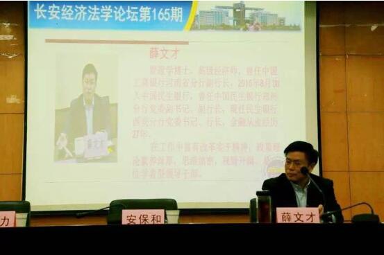2018年10月16日19时30分,长安经济法学论坛第一百六十五期在永利娱乐场官网 雁塔校区研究生综合楼四楼报告厅如期举行。本次论坛特邀民生银行西安分行党委书记、行长,高级经济师薛文才博士做《现代金融体系及其变革方向》的主题讲座。