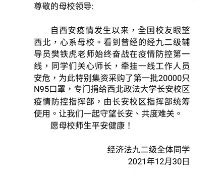 师恩难忘,母校情深。12月31日,在西安新冠肺炎疫情防控最关键的时期,永利娱乐场官网 九二级全体校友共同集资,向母校捐赠20000只N95口罩,尽显校友情深,用实际行动助力母校打赢这场疫情防控攻坚战!