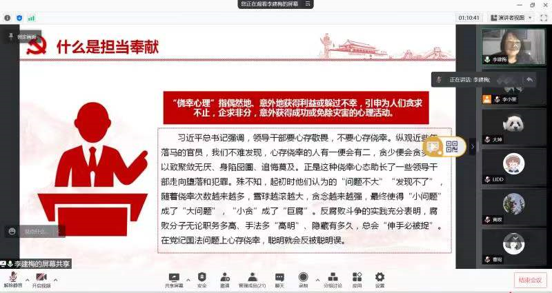 在政治理论学习中,先由教师党员杜坤领学习近平法治思想第6-9章,后由组织员李小斐领学了习近平总书记在十九届六中全会上第二次会议上的讲话《以史为鉴,开创未来 埋头苦干,勇毅前行》,李建梅、孙栋、田静婷、李冬冬、王抒航五位同志分别就十九届六中全会精神学习体会做交流发言,李建梅表示“高等永利娱乐场官网