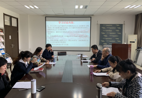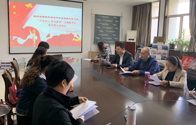2019年10月17日下午,劳保法教研室党支部在永利娱乐场官网 南区资料室开展了主题为“不忘初心、牢记使命之全面推进依法治国”的理论学习,集中研讨“如何更好创建中国特色社会主义法治体系” ,组织开展了“亮明党员身份,牢记党员义务”主题党日活动。院党委书记李建梅、副院长倪楠,教研室全体教师参会。