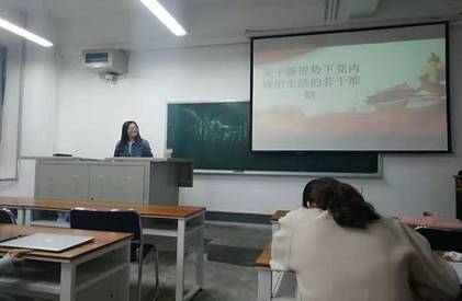 党支部副书记程一桐谈到党要想严肃党的纪律,保证党组织的纯洁,保障党员民主权利,教育党员遵纪守法,维护党的团结统一,保证党的路线、方针、政策、决议和国家法律法规的贯彻执行,最为重要最为基础的是时刻以《若干准则》与《条例》进行自我约束,保持思想上的警觉性与先进性。