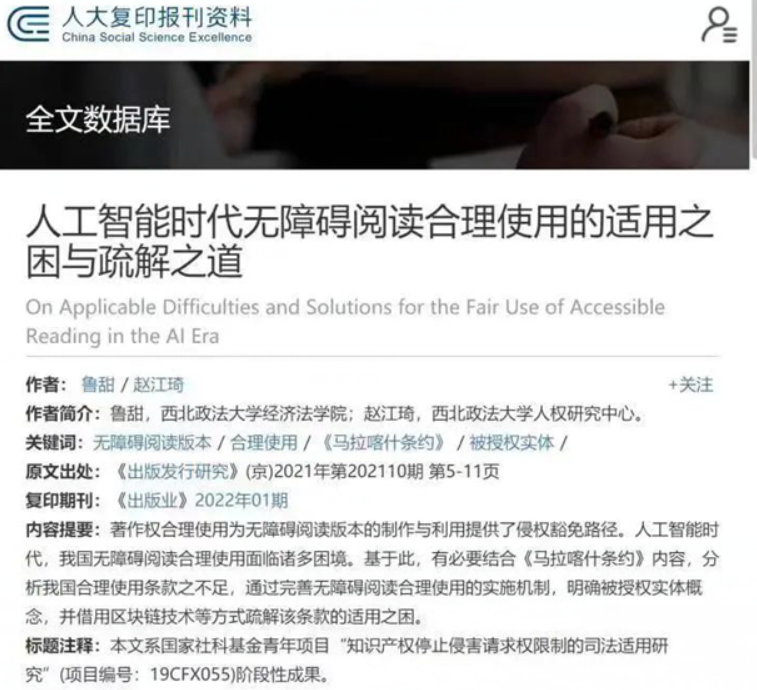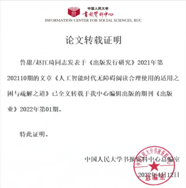 近日,从中国人民大学复印报刊资料数据库获悉,永利娱乐场官网 教师鲁甜博士(一作)的论文《人工智能时代无障碍阅读合理使用的适用之困与疏解之道》被中国人民大学书报资料中心复印报刊资料《出版业》2022年第01期全文转载。该论文原发表于《出版发行研究》2022年第10期。