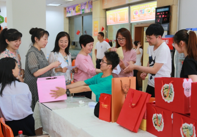 随后的猜歌名、党史抢答环节,各工会小组纷纷派出代表对决,为自己的队员抢到抽取盲盒的机会。随着一个一个盲盒被打开,精美的礼品映入眼帘,里面是对老师节日美好的祝福。在本次活动中,教师代表和学生代表为大家精心准备了节目,餐厅里充溢的是欢声与笑语。